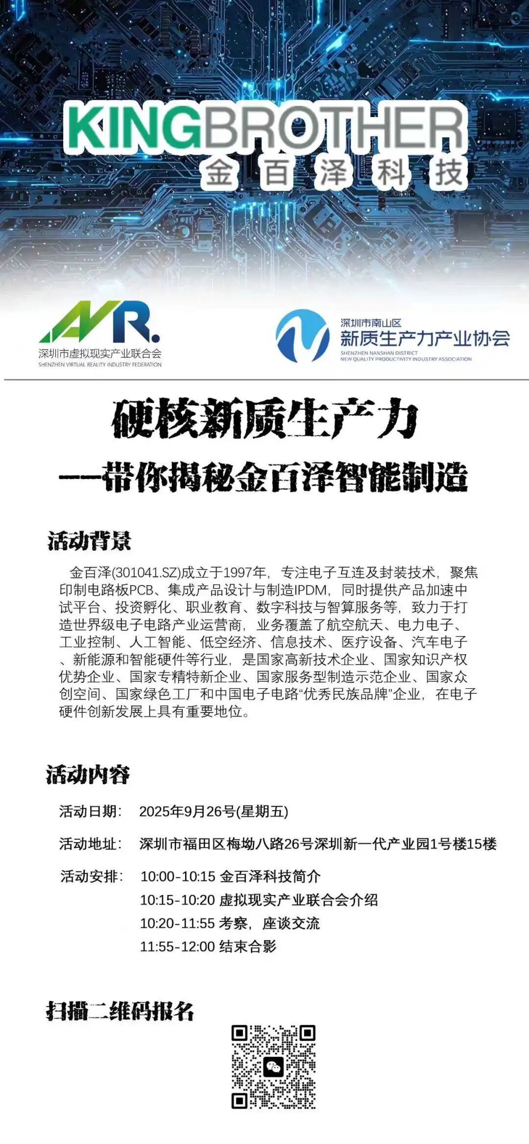 为洞察智能制造前沿趋势,链接产业核心资源,深圳市虚拟现实产业联合会与深圳市南山区新质生产力产业协会,特联合行业领军企业金百泽科技(股票代码:301041),诚邀您参加“探秘硬核新质生产力:走进金百泽智能制造”专项考察活动。在全球产业链加速重构的时代,智能化转型已是企业发展的核心引擎。我们期待与您共同探索科技前沿,发掘产业新机遇。