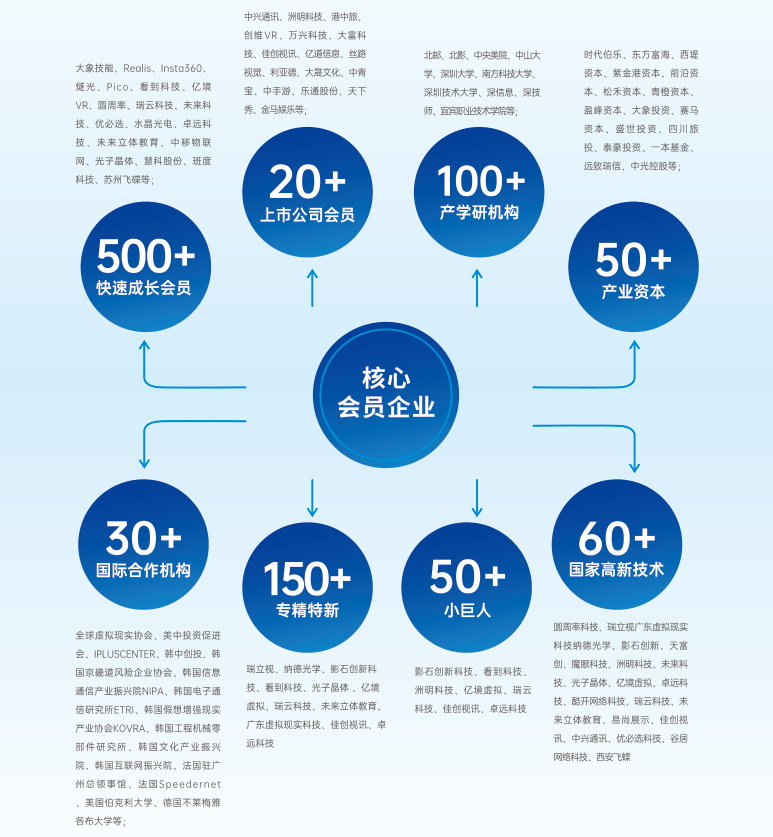 联合会始终站在行业最前沿,致力于推动VR/AR产业的创新发展。核心会员包括DELL、Oculus、VIVE、SONY、HTC、SAMSUNG及国内领军企业Rokid、Insta360、Pico、中兴通讯、优必选、中旅国际、洲明科技等,同时孵化出深圳市南山区新质生产力产业协会,总产值超千亿元,构筑了强大的行业影响力。抢抓新质生产力发展机遇,建设VR/AI全产业链生态矩阵和应用生态体系,推动AI、VR产业高质量发展。在推动虚拟现实、人工智能、新兴科技等相关企业发展方面发挥着举足轻重的作用。